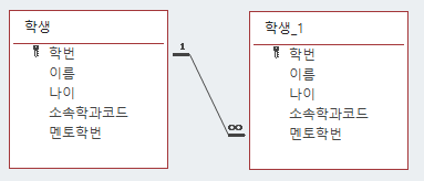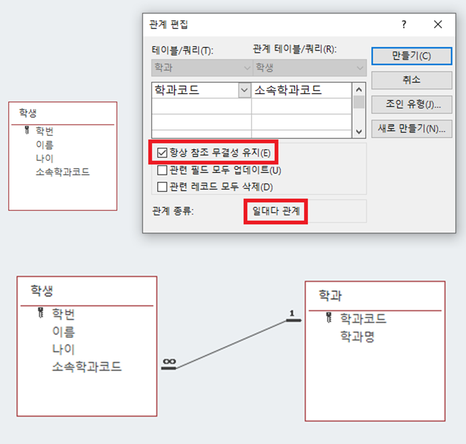 - 학과 테이블 '학과코드'를 학생 테이블 '소속학과코드'에 드래그하여 관계를 만듦.
