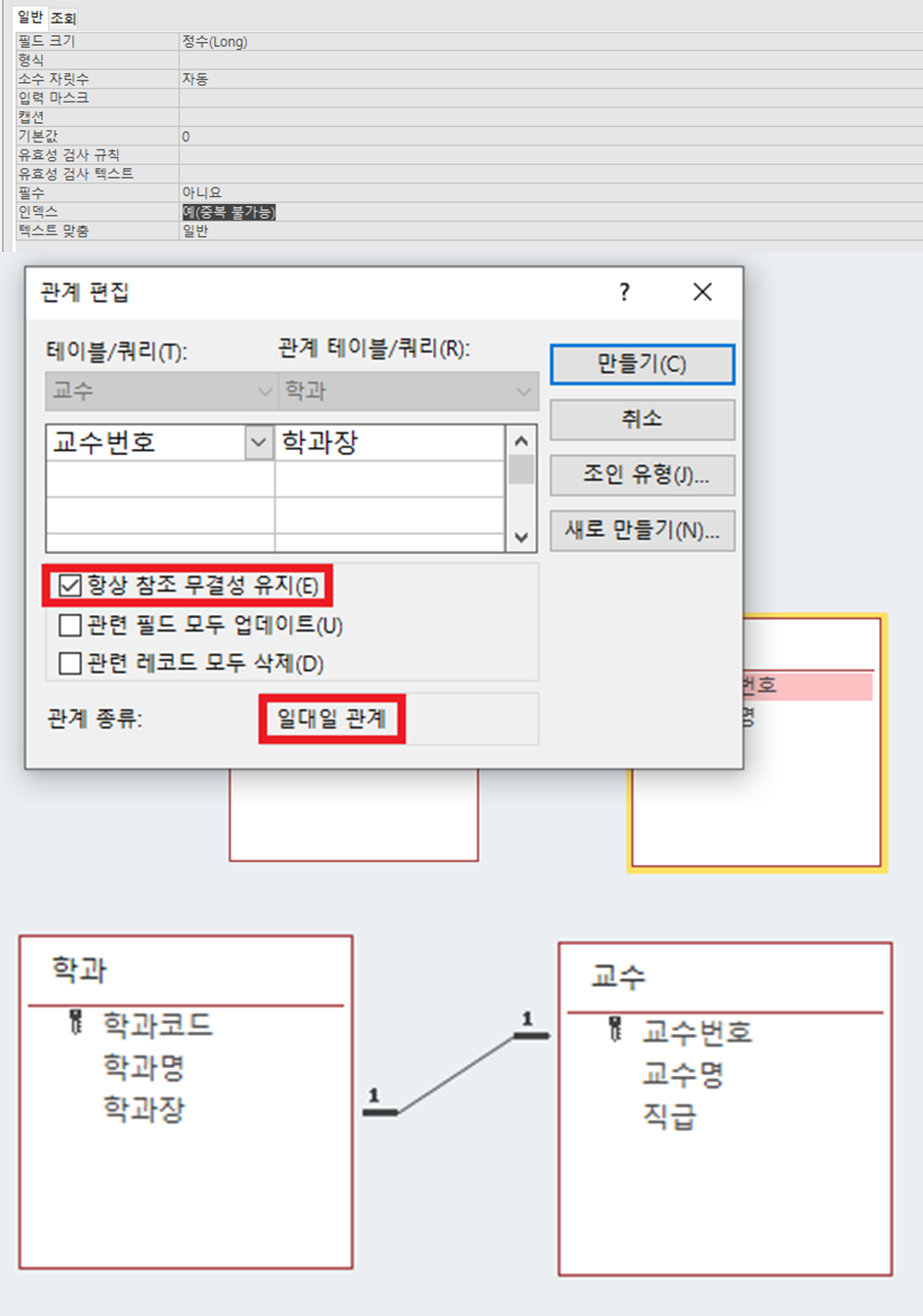 - 교수 테이블의 '교수번호'를 학과 테이블의 '학과장'에 드래그하여 관계를 만듦.