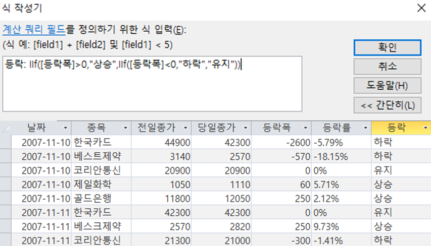 - [등락] 칼럼을 추가하여, 등락폭이 양수이면 "상승", 음수이면 "하락", 0이면 "유지"를 출력