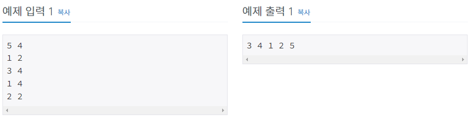 둘째 줄부터 M개의 줄에는 바구니의 순서를 역순으로 만드는 방법이 주어진다. 방법은 i j로 나타내고, 왼쪽으로부터 i번째 바구니부터 j번째 바구니의 순서를 역순으로 만든다는 뜻이다. (1 ≤ i ≤ j ≤ N)