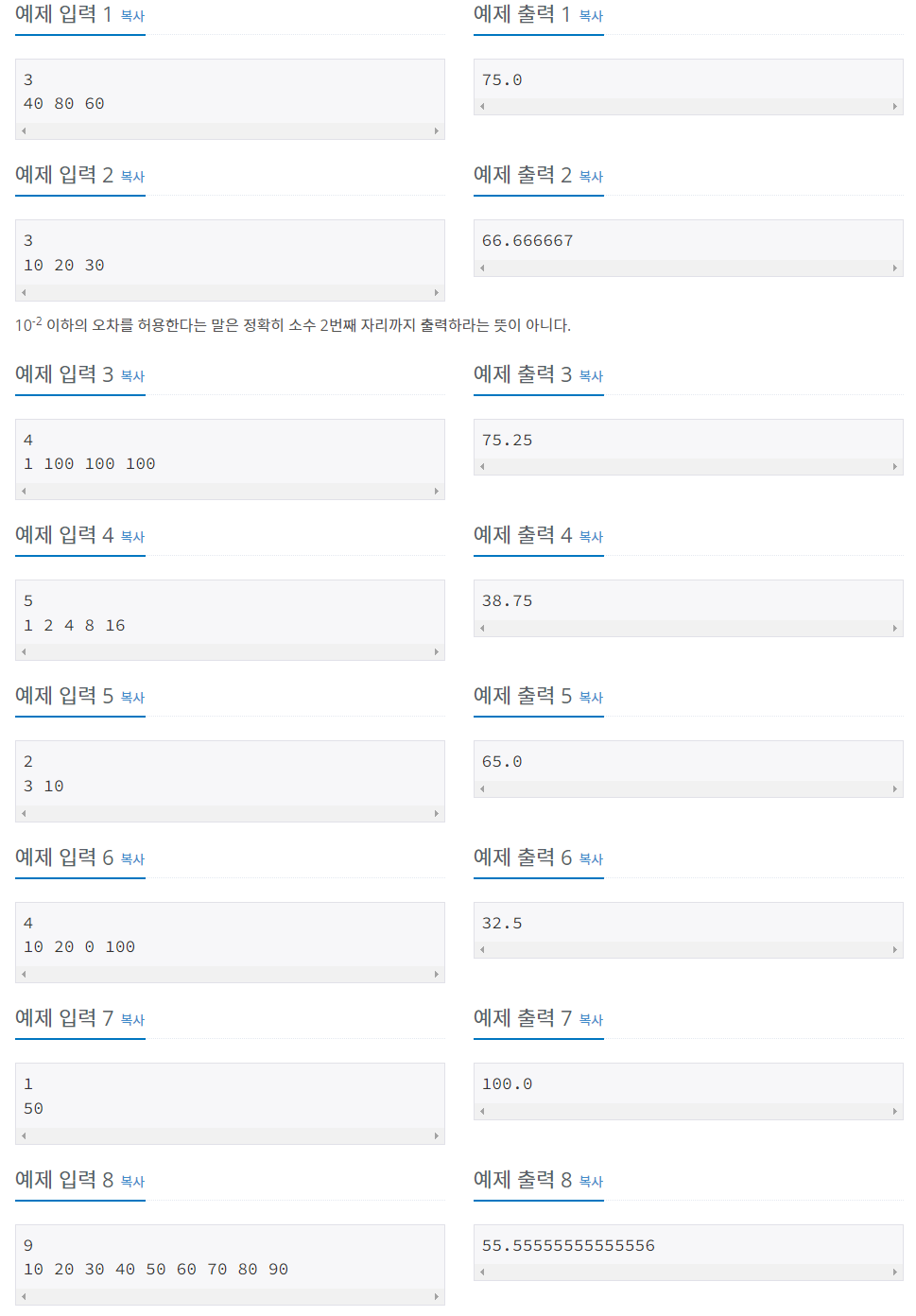 첫째 줄에 새로운 평균을 출력한다. 실제 정답과 출력값의 절대오차 또는 상대오차가 10-2 이하이면 정답이다.