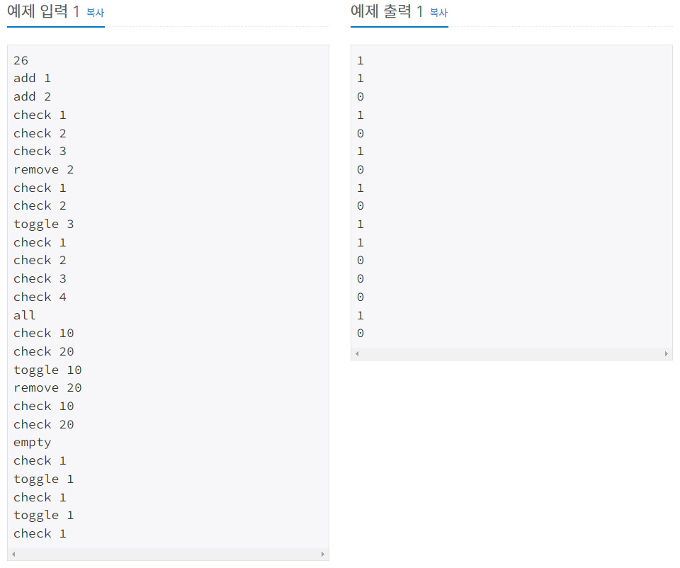- toggle x: S에 x가 있으면 x를 제거하고, 없으면 x를 추가한다. (1 ≤ x ≤ 20)