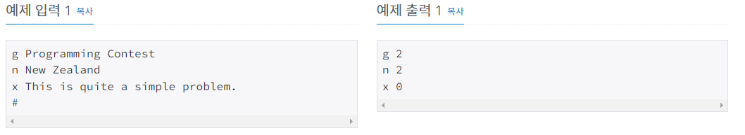 출력의 각 줄은 입력으로 주어진 소문자와 그 소문자 알파벳이 나타난 횟수로 이루어진다. 이때 문장에서 해당 알파벳이 소문자로 나타나던 대문자로 나타나던 모두 세야 한다.