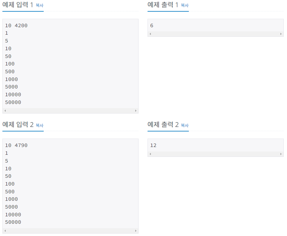 첫째 줄에 N과 K가 주어진다. (1 ≤ N ≤ 10, 1 ≤ K ≤ 100,000,000) 둘째 줄부터 N개의 줄에 동전의 가치 Ai가 오름차순으로 주어진다. (1 ≤ Ai ≤ 1,000,000, A1 = 1, i ≥ 2인 경우에 Ai는 Ai-1의 배수)