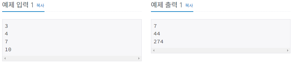 첫째 줄에 테스트 케이스의 개수 T가 주어진다. 각 테스트 케이스는 한 줄로 이루어져 있고, 정수 n이 주어진다. n은 양수이며 11보다 작다.