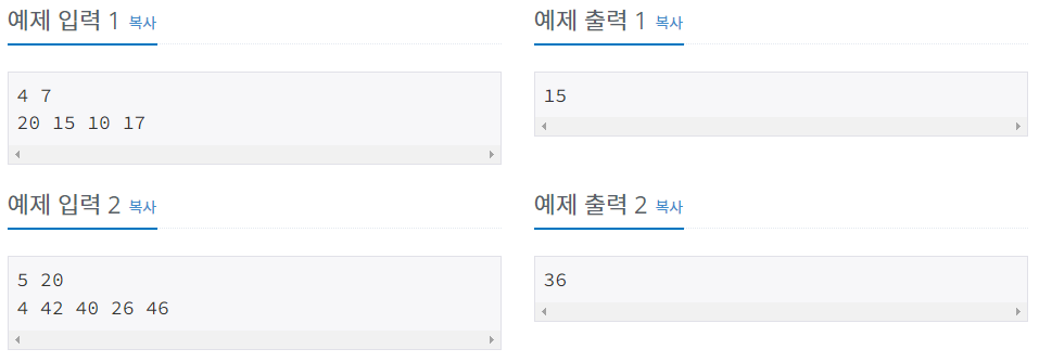 첫째 줄에 나무의 수 N과 상근이가 집으로 가져가려고 하는 나무의 길이 M이 주어진다. (1 ≤ N ≤ 1,000,000, 1 ≤ M ≤ 2,000,000,000)