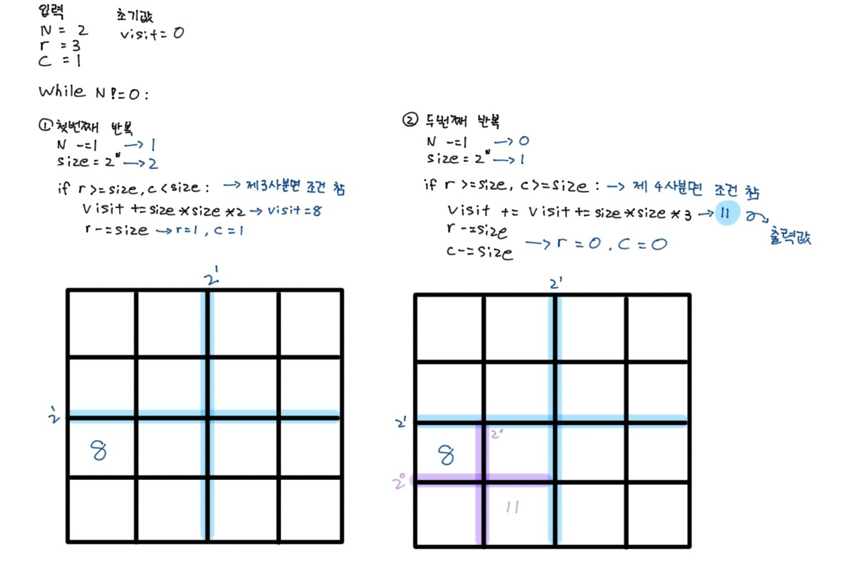 한수는 크기가 2N × 2N인 2차원 배열을 Z모양으로 탐색하려고 한다. 예를 들어, 2×2배열을 왼쪽 위칸, 오른쪽 위칸, 왼쪽 아래칸, 오른쪽 아래칸 순서대로 방문하면 Z모양이다.