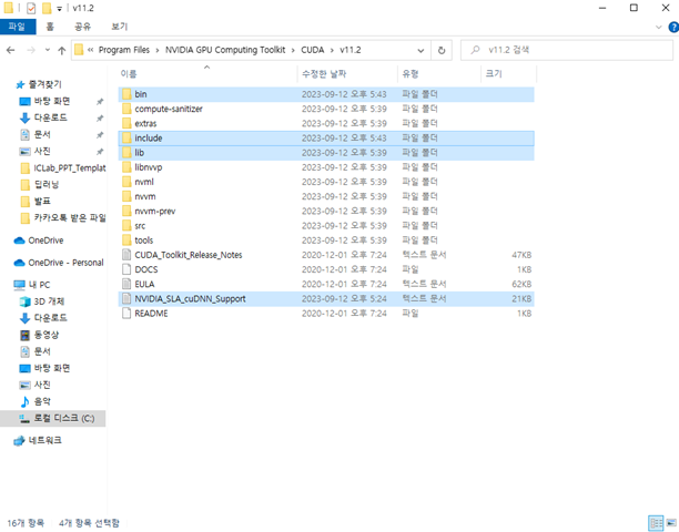- cuDNN이 설치되었다면 압축을 푼 후 CUDA 폴더에 cuDNN 파일을 붙여넣음