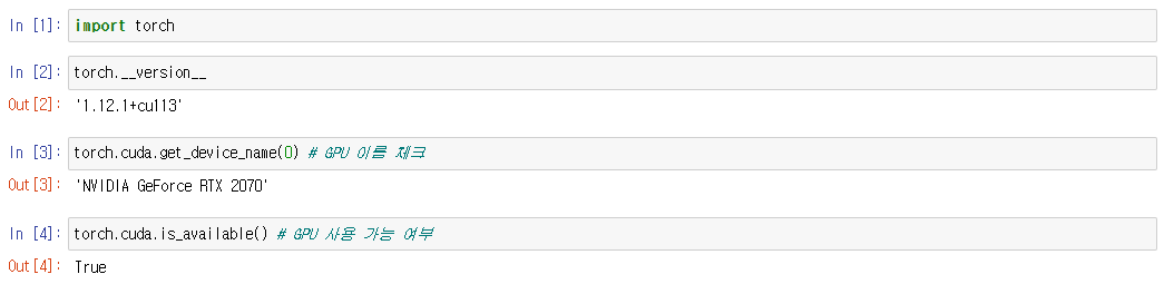- 주피터 노트북에서 가상환경으로 파일을 열고 pytorch의 버전 및 GPU를 확인함