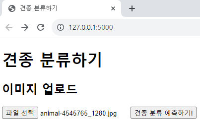 - '파일 선택'을 통해 이미지 업로드 후 파일명을 확인하고 '견종 분류 예측하기!'버튼을 클릭함