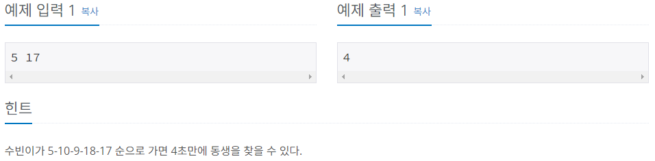첫 번째 줄에 수빈이가 있는 위치 N과 동생이 있는 위치 K가 주어진다. N과 K는 정수이다.