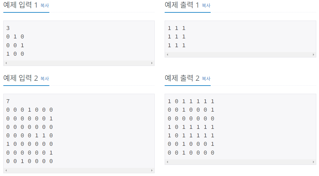 첫째 줄에 정점의 개수 N (1 ≤ N ≤ 100)이 주어진다. 둘째 줄부터 N개 줄에는 그래프의 인접 행렬이 주어진다. i번째 줄의 j번째 숫자가 1인 경우에는 i에서 j로 가는 간선이 존재한다는 뜻이고, 0인 경우는 없다는 뜻이다. i번째 줄의 i번째 숫자는 항상 0이다.