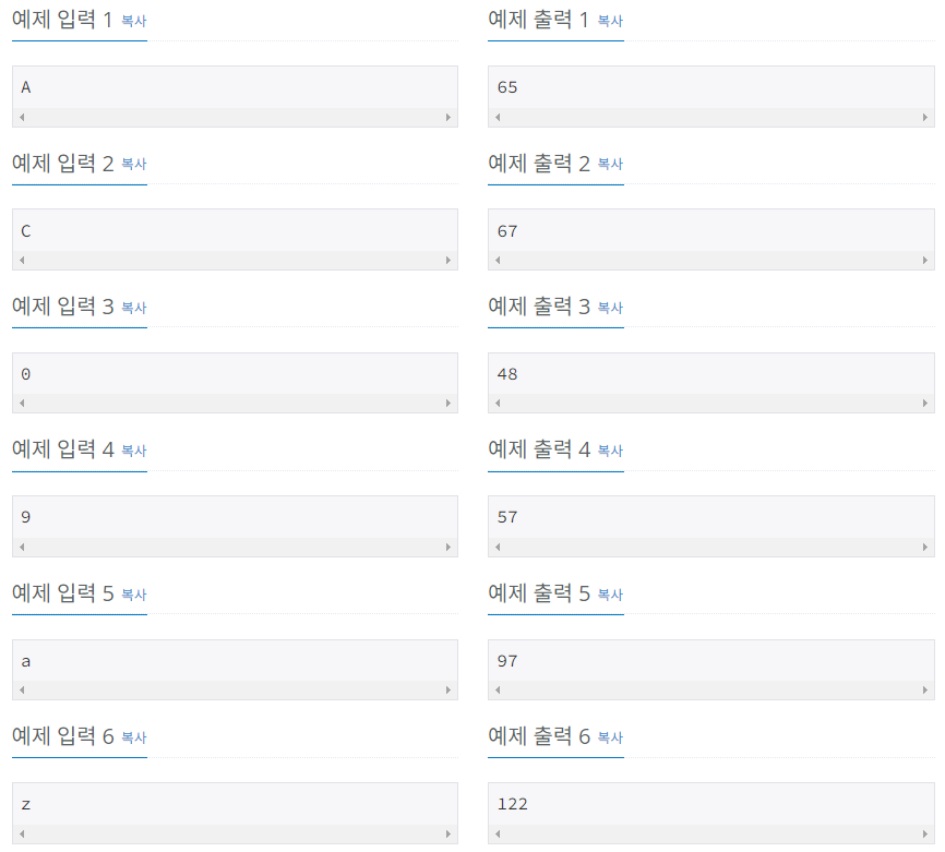 입력으로 주어진 글자의 아스키 코드 값을 출력한다.