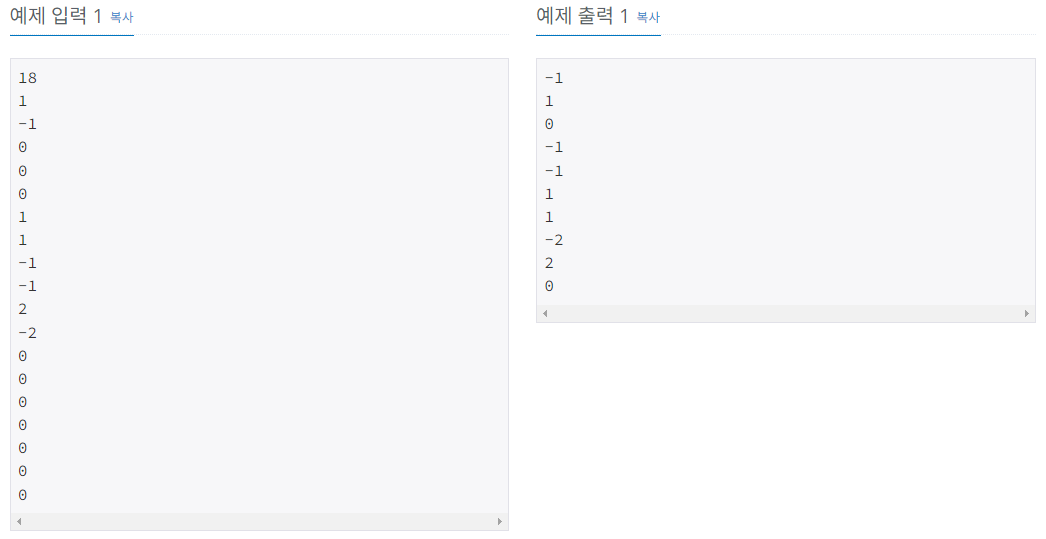 첫째 줄에 연산의 개수 N(1≤N≤100,000)이 주어진다. 다음 N개의 줄에는 연산에 대한 정보를 나타내는 정수 x가 주어진다. 만약 x가 0이 아니라면 배열에 x라는 값을 넣는(추가하는) 연산이고, x가 0이라면 배열에서 절댓값이 가장 작은 값을 출력하고 그 값을 배열에서 제거하는 경우이다. 입력되는 정수는 -2³¹보다 크고, 2³¹보다 작다.