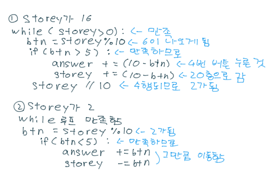 문제를 읽다보니 그리디가 생각났습니다. storey가 0보다 크다는 조건을 만족하는 동안 반복하는 while루프를 이용했습니다. storey%10을 구해 일의 자리 숫자를 구합니다. 이것은 -,+ 중 어느 방향으로 갈지를 정하게 됩니다. btn이 5보다크면 층을 올라가는게 낫기 때문에 answer에 (10-btn)층 만큼 더하고 storey도 그만큼 더합니다. 반대로 5보다 작으면 층을 내려가는게 더 빠르기 때문에 answer에 btn층을 더하고 storey은 btn만큼 뺍니다. 만약 5라면 그 앞의 자릿수를 구해 비교해서 계산하여 일의 자리 숫자를 0으로 맞춥니다. 일의 자리 숫자만큼은 이동한 것이므로 storey //= 10을 합니다.