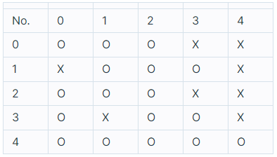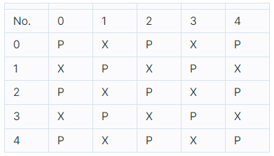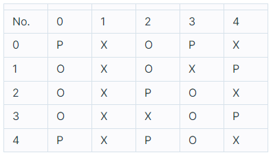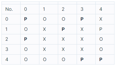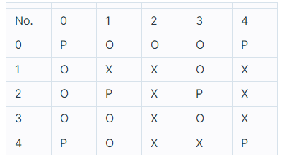 | [["POOOP", "OXXOX", "OPXPX", "OOXOX", "POXXP"], ["POOPX", "OXPXP", "PXXXO", "OXXXO", "OOOPP"], ["PXOPX", "OXOXP", "OXPOX", "OXXOP", "PXPOX"], ["OOOXX", "XOOOX", "OOOXX", "OXOOX", "OOOOO"], ["PXPXP", "XPXPX", "PXPXP", "XPXPX", "PXPXP"]] | [1, 0, 1, 1, 1] |