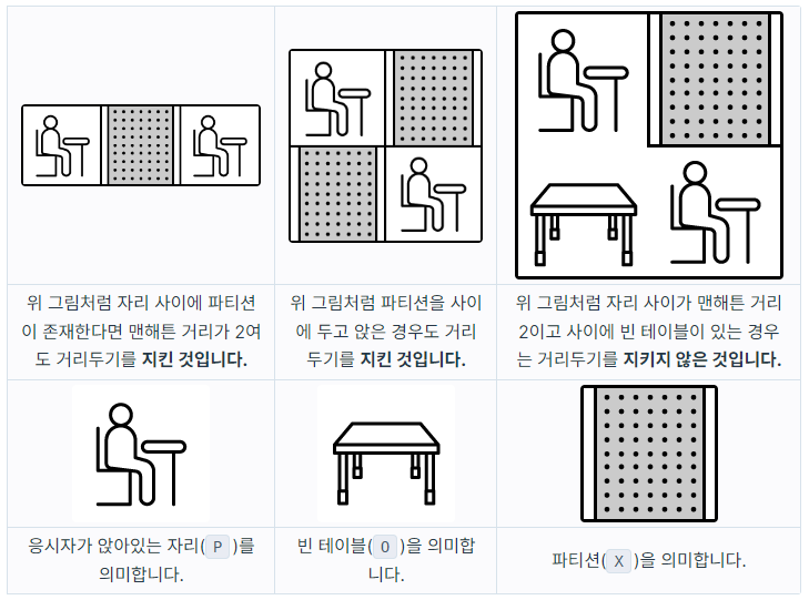 5개의 대기실을 본 죠르디는 각 대기실에서 응시자들이 거리두기를 잘 기키고 있는지 알고 싶어졌습니다. 자리에 앉아있는 응시자들의 정보와 대기실 구조를 대기실별로 담은 2차원 문자열 배열 places가 매개변수로 주어집니다. 각 대기실별로 거리두기를 지키고 있으면 1을, 한 명이라도 지키지 않고 있으면 0을 배열에 담아 return 하도록 solution 함수를 완성해 주세요.