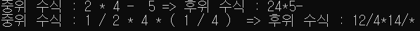 - 피연산자를 만나면 바록 출력하고 연산자를 만나면 스택에 저장함.