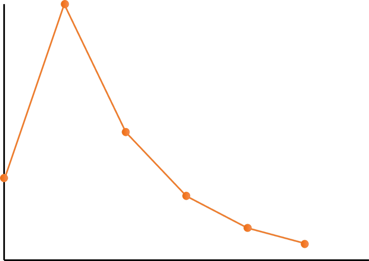 은지는 우박수열을 좌표 평면 위에 꺾은선 그래프로 나타내보려고 합니다. 초항이 k인 우박수열이 있다면, x = 0일때 y = k이고 다음 우박수는 x = 1에 표시합니다. 이런 식으로 우박수가 1이 될 때까지 점들을 찍고 인접한 점들끼리 직선으로 연결하면 다음과 같이 꺾은선 그래프를 만들 수 있습니다.