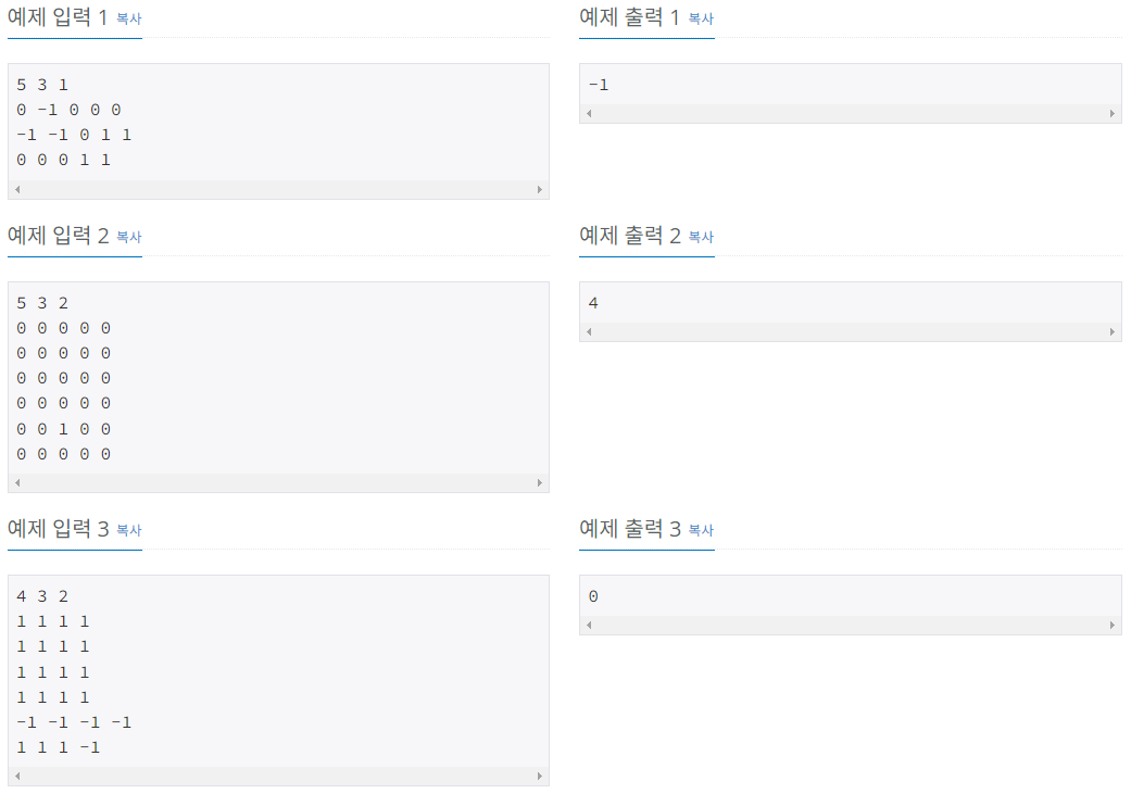 첫 줄에는 상자의 크기를 나타내는 두 정수 M,N과 쌓아올려지는 상자의 수를 나타내는 H가 주어진다. M은 상자의 가로 칸의 수, N은 상자의 세로 칸의 수를 나타낸다. 단, 2 ≤ M ≤ 100, 2 ≤ N ≤ 100, 1 ≤ H ≤ 100 이다. 둘째 줄부터는 가장 밑의 상자부터 가장 위의 상자까지에 저장된 토마토들의 정보가 주어진다. 즉, 둘째 줄부터 N개의 줄에는 하나의 상자에 담긴 토마토의 정보가 주어진다. 각 줄에는 상자 가로줄에 들어있는 토마토들의 상태가 M개의 정수로 주어진다. 정수 1은 익은 토마토, 정수 0 은 익지 않은 토마토, 정수 -1은 토마토가 들어있지 않은 칸을 나타낸다. 이러한 N개의 줄이 H번 반복하여 주어진다.