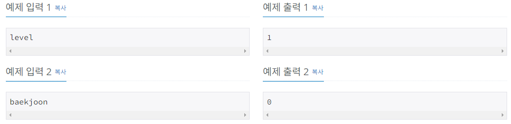 level, noon은 팰린드롬이고, baekjoon, online, judge는 팰린드롬이 아니다.