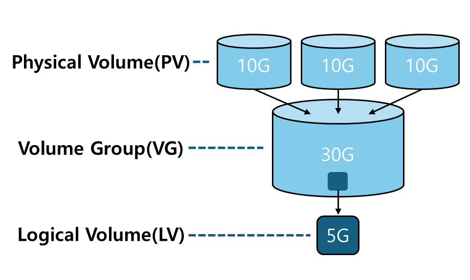 - 'PV'로 되어 있는 파티션을 하나의 물리적인 그룹으로 만듦