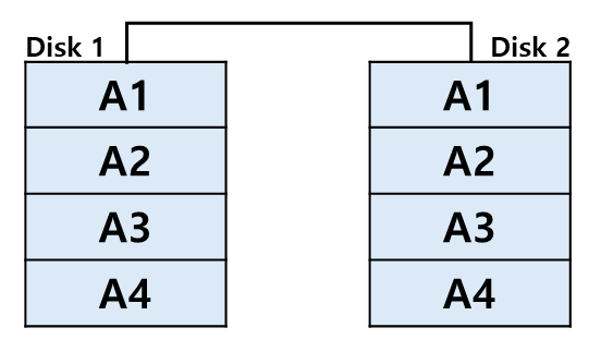 - 같은 데이터 2개 디스크에 저장하여 복사본 만드는 미러링을 통해 하나의 디스크처럼 사용