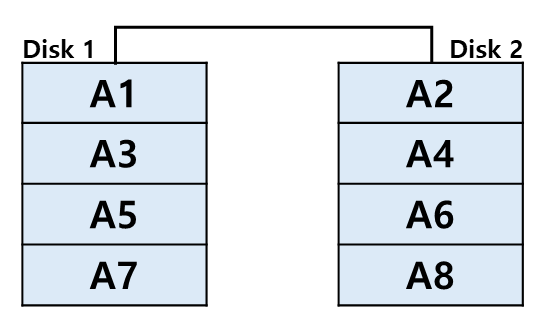 - 연속된 데이터들을 디스크 드라이브에 나눠서 저장하는 스트라이핑을 사용