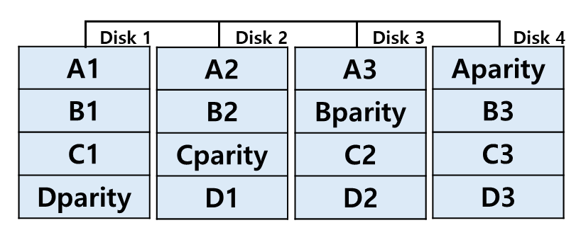 - 3개 이상의 디스크를 사용해 하나의 디스크처럼 사용, 각각 디스크에 패리티 정보 가짐