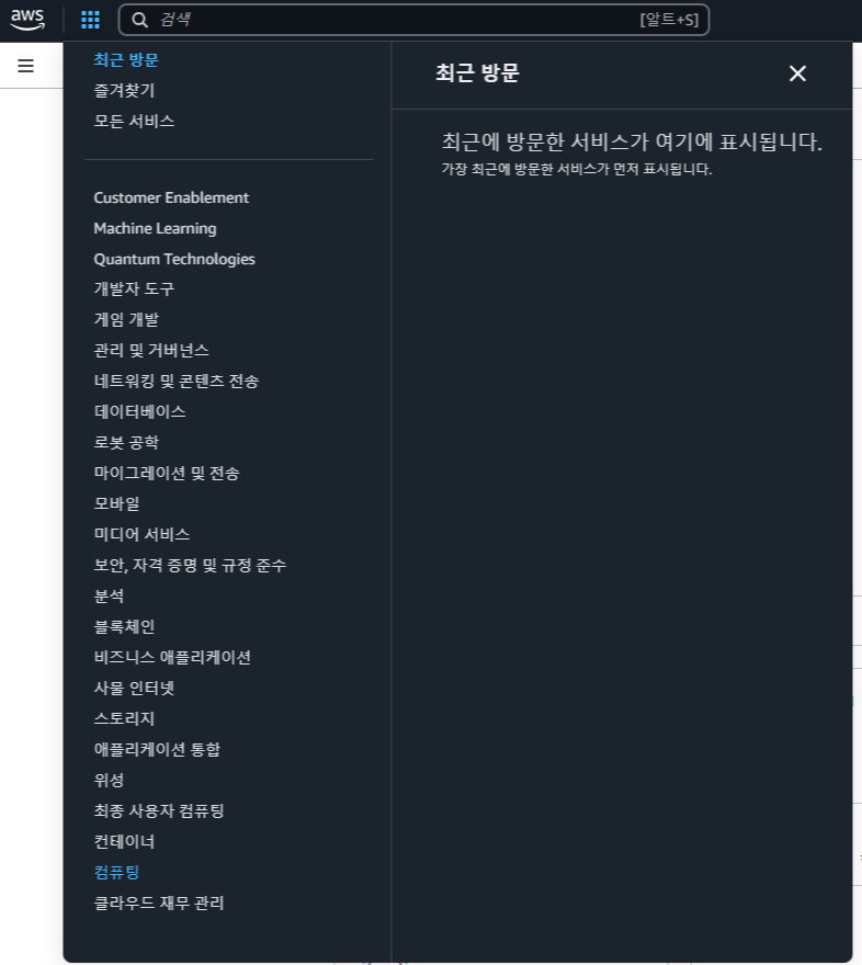 - 가까운 리전을 사용하는 이유는 데이터 전송이 빨라져 서비스 응답 속도 빨라지고 비용도 절약 - 메뉴 클릭해서 '컴퓨팅' - 'EC2' 클릭