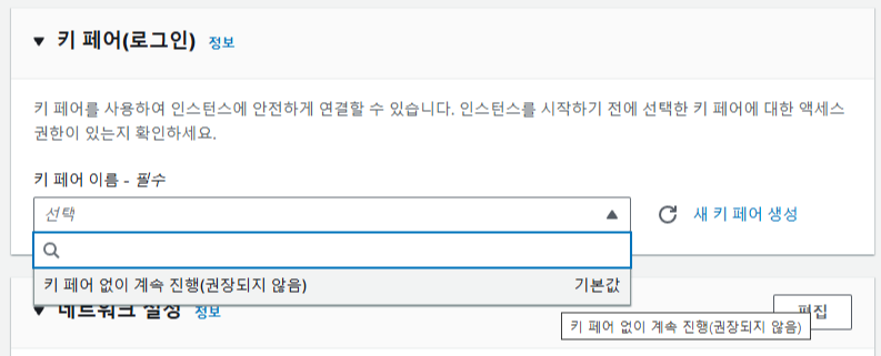 - 키 페어(로그인) 부분 '키페어 없이 계속 진행' 선택