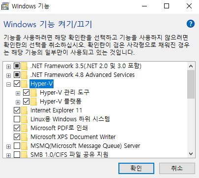 - 모든 Hyper-V 항목이 체크되었는지 확인