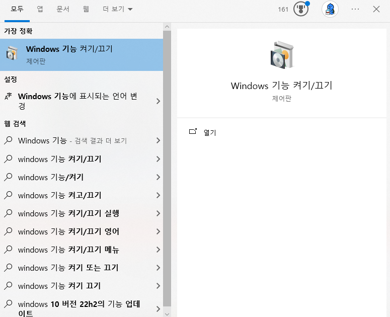- Windows 기능 켜기/끄기 검색 후 클릭