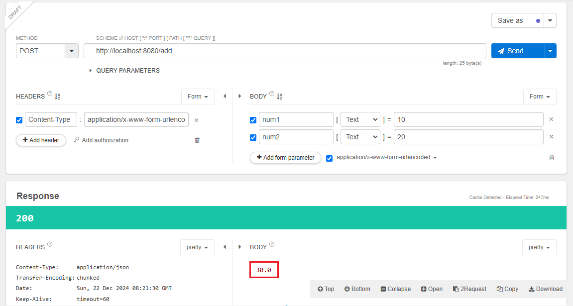 - 빼기의 URL 입력 후 Send 버튼을 누르면 뺀 결과가 출력됨