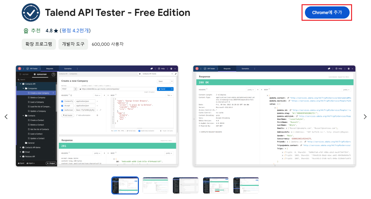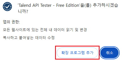 - 크롬 웹스토어에 'Talend API Tester - Free Edition' 검색하여 'Chrome에 추가' 버튼 클릭