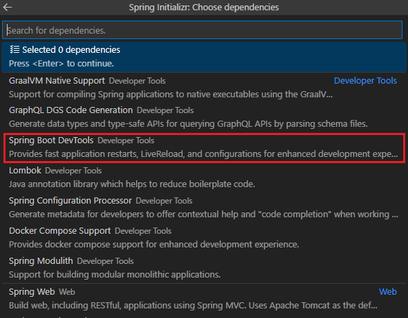 - Java Web Site 실행 : *.War - Spring Boot Dev Tools를 선택함
