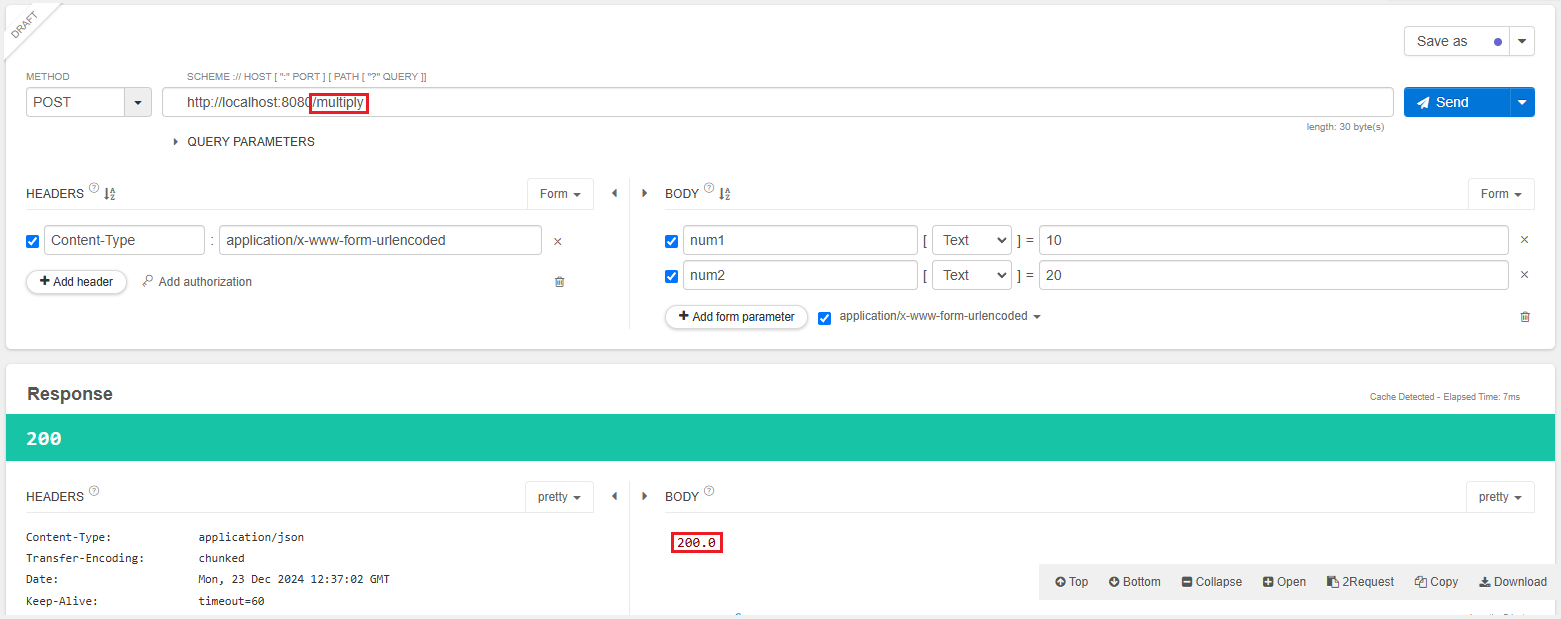 - 곱하기의 URL 입력 후 Send 버튼을 누르면 곱한 결과가 출력됨