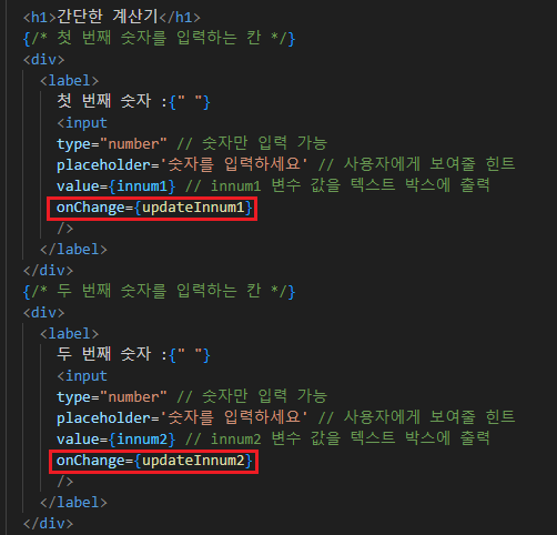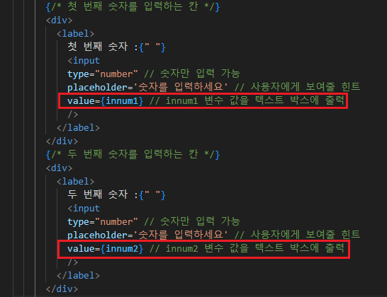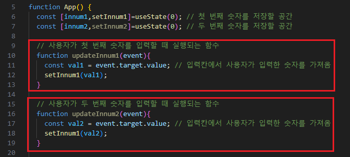 - React에서는 데이터를 직접 바꾸지 않고, setInnum1이나 setInnum2라는 도구를 사용해서만 데이터 변경 가능 - useState(0)