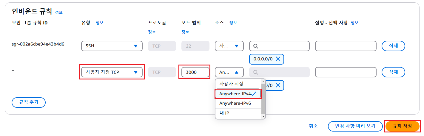 - EC2의 3000 포트를 사용 가능하도록 설정함
