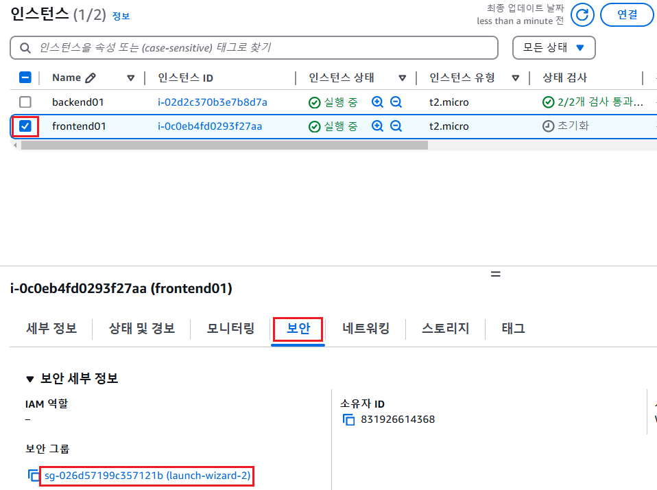 - 프론트엔드 인스턴스 체크 후 보안- 보안그룹의 링크를 선택함
