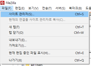 - 파일질라를 실행 후 파일-사이트 관리자를 선택
