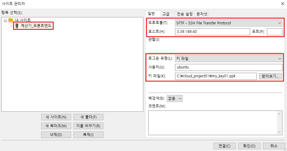 - 키 파일 : 찾아보기 클릭 후 c:\cloud_project01\my_key01.ppk 파일을선택
