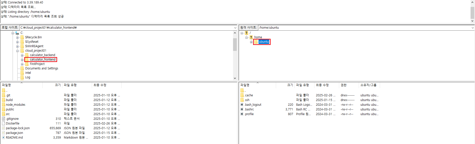 - 왼쪽에서 EC2로 전송할 폴더선택 (c:\cloud_project01\calculator_frontend)