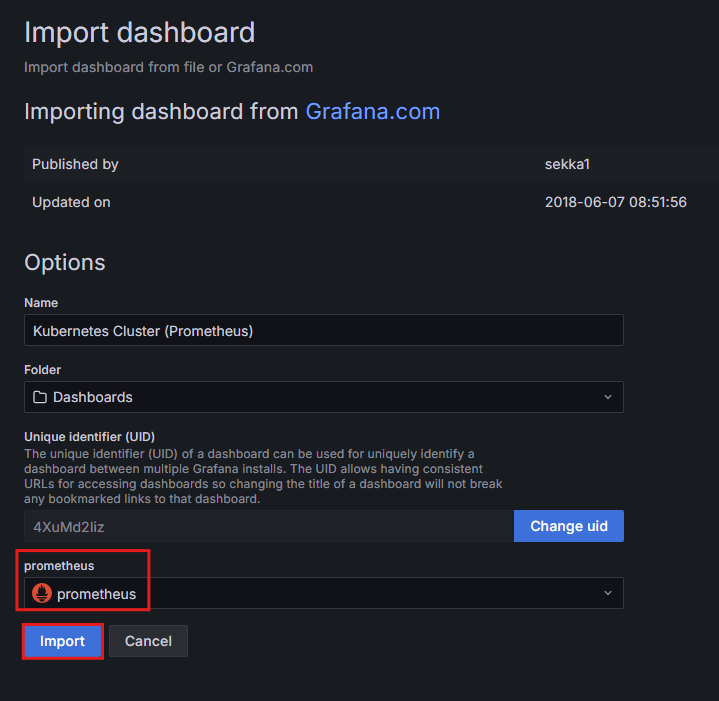 - Prometheus에 Prometheus를 선택한 후 Import를 클릭함