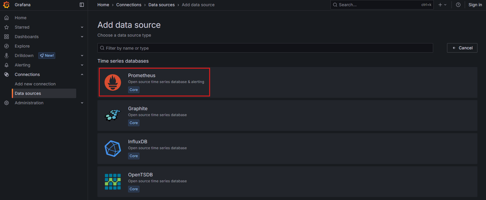 - 화면에서 add your first data source를 클릭함 - Prometheus를 클릭함