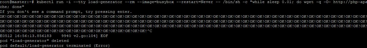 kubectl run -i --tty load-generator --rm --image=busybox --restart=Never -- /bin/sh -c "while sleep 0.01; do wget -q -O- http://php-apache; done"