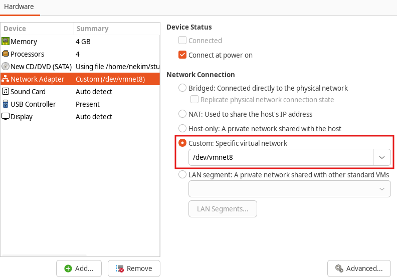 - 네트워크 어댑터는 VMnet8번 NAT으로 설정함