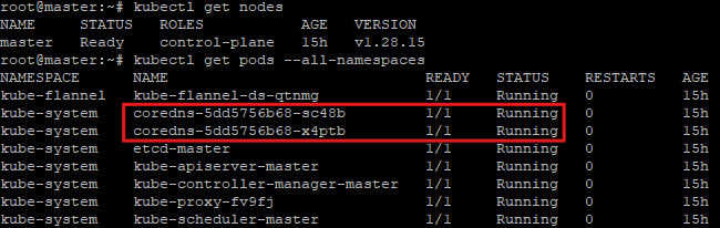 - 플라넬 CNI 플러그인이 정상적으로 설치되면 다음 명령어를 입력해 CoreDNS 파드가 실행 중(running)인지 확인함. CoreDNS 파드가 실행 중이어야 파드들의 네트워크 통신이 가능함