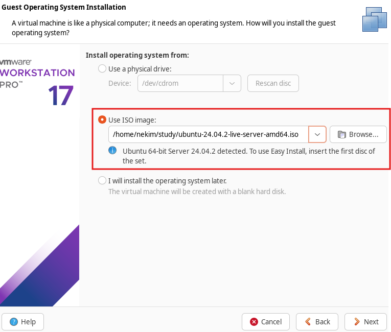 - 이제 vm은 만들어졌고 다운받은 ubuntu iso 파일로 서버를 설치함