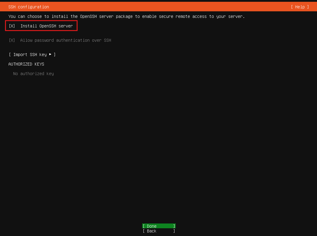 - SSH 설정에서 'Install OpenSSH server' 체크하고 진행함